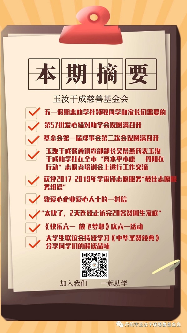 荣誉代表过去,我们将会把荣誉化为动力,再接再厉,为我们丹阳贫困学子和弱势家庭再助力!