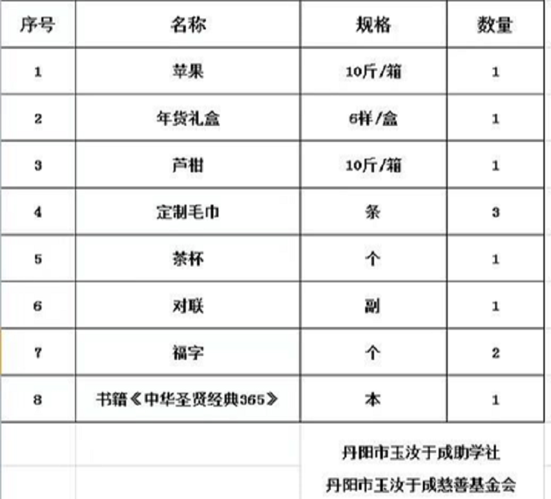 2020年春节玉汝于成慈善慰问受助学生物资:共345人,单份价:180元,总计:62100元