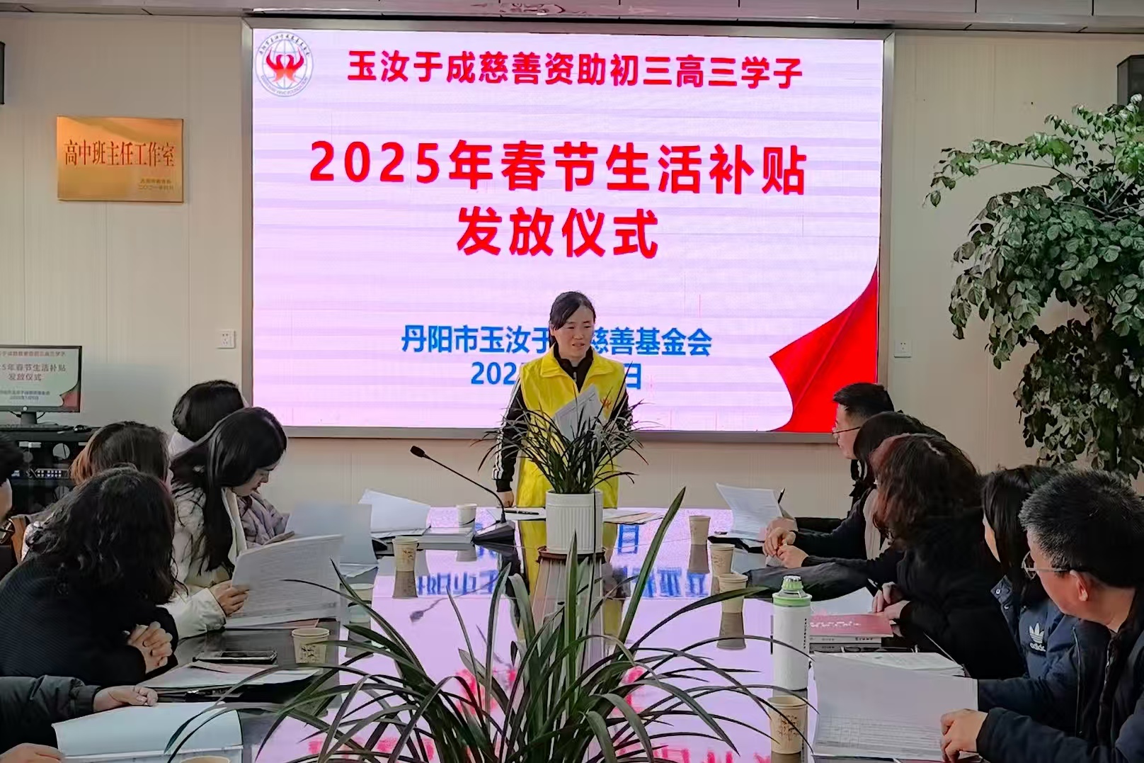 在2025年春节来临之际,为鼓励受资助的初三、高三学生刻苦学习、努力拼搏,迎战即将到来的中高考,玉汝于成慈善于2025年1月6日下午在丹阳市马相伯高级中学行政楼三楼会议室,举办了初三高三学生春节生活补贴发放活动。各学校负责学生资助德育工作的主任、玉汝于成慈善党支部书记戎南楼、玉汝于成慈善办公室主任汤爱仙出席本次活动。
